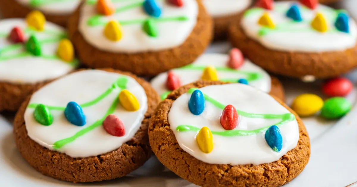 Cover each biscuit with the white icing and pipe a string using the green icing. Place the halved M&Ms on the green line, creating the look of Christmas lights.