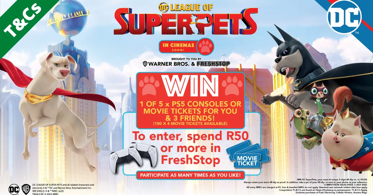 This Promotional Competition is organized by FreshStop Holdings (PTY) LTD, their designated agencies PESSO Marketing CC (collectively “the Promoters”) or “Organizers” and in license with Warner Bros Entertainment Inc. DC LEAGUE OF SUPER-PETS and all related characters and elements © & ™ DC and Warner Bros. Entertainment Inc. WB SHIELD: © & ™ WBEI. (s22). TM & © DC © 2022 WBEI.